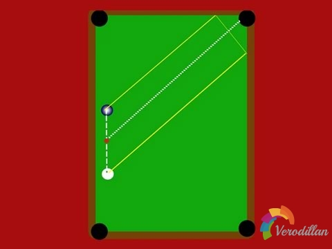 兩庫解球稍微龐大一些,我們需要先找到母球和目的球連線的正中央位置,即圖中小紅點的位置,然后將此位置與解球蹊徑一側的袋口連線,再將此線向母球和目的球平移,所得出的這條蹊徑即為解球線路。