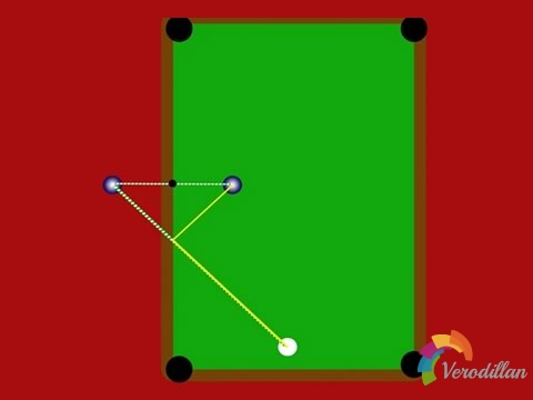 這是母球和目的球與庫邊平行的情形下,我們只需要找到兩顆球中央的點,然后垂直于另一側的庫邊點位就是解球點。
