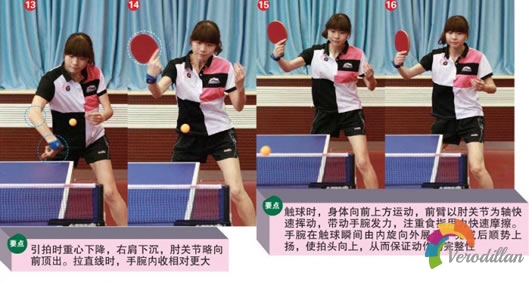 本篇樹模隊員的特點是手感好,線路和落點的意識強,且反手手藝相對突出。因此反手發球后銜接搶位是她主要的得分手段。反手發側上、下旋球時要注重以肘動員前臂,手腕發力摩擦要突然,同時身體向前壓。發球后,身體要迅速還原,當對方回球到自己的反手位時,要注重收腹,降低重心;同時右肩下沉,肘樞紐略向前頂出。觸球時,身體向前上方發力,前臂以肘樞紐為軸,快速揮舞并帶著手腕手指舉行發力。若是拉直線,手腕內收的幅度要更大,同時要行使身體重心輔助擊球。