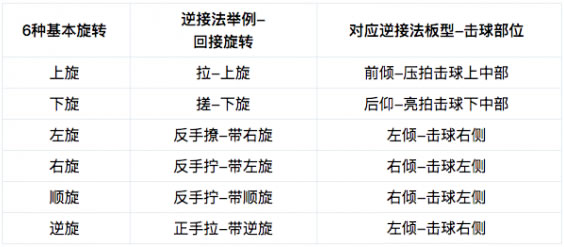 2. 除開6種基本旋轉(來球旋轉)的偏向以弧線制造方視角來界說偏向,其余都以回接方視角來界說種種偏向。