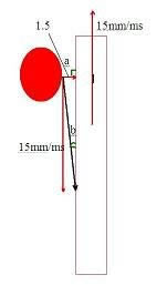 假設時間點為球觸拍前的最后1毫秒,請參看圖2。球水平向右航行1.5mm垂直撞向套膠外面。就在同時,球拍也向上揮舞了15mm,即球沿拍面向下相對位移15mm。該角度的正切值tan =1.5/15=0.1。響應角度為5.7度。