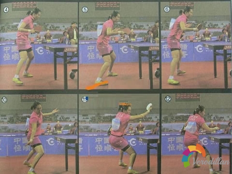 李曉霞站在反手偏中路的位置發了一個短球,拋球歷程中重心處于右腿,當準備接觸球的瞬間重心轉移到左腿上,隨著球蟲球拍擊出的啥那最先還原步法,李曉霞接納的是一步還原法,由于李曉霞發球時,通過腰部順時針轉動發力,因此在發球后的幻云動作中,李曉霞就借助順時針的發力偏向,右腳直接順勢向右前方跨出完成還原的第一步,之后左腳向右側墊一小步,并朝向球臺,這一個“小墊步”不僅使得身體順時針旋轉面向球臺,而且保證了兩腿之間的距離也調整到了最佳狀態,為下一板進攻做好準備。