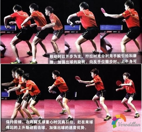 移動時以并步為主,擰拉時充實行使手腕引拍和摩擦,增強出球的旋轉。向反手位撤步時,上半身可保持前傾,在兩腳支持重心時沉肩引拍,趕在來球彈起的上升期迎前擊球,增強出球的速率優勢。