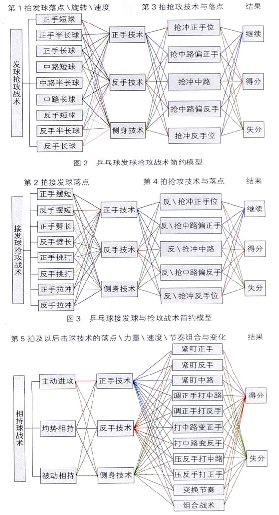 乒乓球戰(zhàn)術(shù)是指運(yùn)動(dòng)員根據(jù)對(duì)方的打法類(lèi)型、技術(shù)特點(diǎn)等而采用的各種技術(shù)手段與方法,其特點(diǎn)是伴有旋轉(zhuǎn)、技術(shù)、落點(diǎn)、弧線(xiàn)、線(xiàn)路、速度、力量與節(jié)奏等變化(圖1),并帶有明顯攻擊或限制對(duì)手的目的,前后連續(xù)二個(gè)或兩個(gè)以上技術(shù)動(dòng)作的組合運(yùn)用。與其它球類(lèi)項(xiàng)目相比較,千變?nèi)f化的旋轉(zhuǎn)是乒乓球比賽戰(zhàn)術(shù)最大的特點(diǎn),如轉(zhuǎn)與不轉(zhuǎn)的發(fā)球或削球本身即為一種戰(zhàn)術(shù)。www.qikan.com.cn7lXUR35sSi9fLXVO