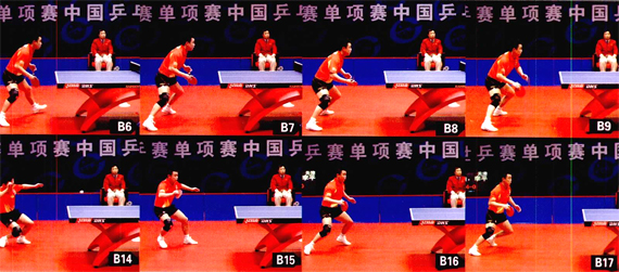 組圖B中,王皓同樣發(fā)正手鉤子短球,發(fā)球后他退至中近臺,準(zhǔn)備反手橫拉(圖7-8)。當(dāng)他發(fā)現(xiàn)對方接發(fā)球劈長到自己反手位時,如果此時用反手在來球的低點橫拉,很容易造成回球失誤,因此他果斷側(cè)身(圖9),畢竟正手進攻后的銜接相對流暢。王皓的側(cè)身稍慢,來球的力量偏小,王皓的身體無法調(diào)整到最佳位置,他壓低身體重心,右腿蹬地,左腳向左側(cè)跨出,并用左腳的前腳掌支撐身體(圖10-12)。由于來球過于貼近身體并位于下降期,王皓將右腿膝蓋向左側(cè)轉(zhuǎn)動,讓出擊球空間(圖13)。在擊球瞬間,王皓將球拍拍面立起,幾乎與地面完全垂直,隨后他發(fā)力向上摩擦,并通過手腕向上突然轉(zhuǎn)動來增強摩擦(圖13—14)。擊球后,王皓左腿向后蹬地,右腿后撤,使身體瞬間騰空后撤,并保持上身前傾(圖15-17)。王皓的第一板在非正常位置下進攻,雖然威脅不大,但他還原迅速,這樣可以更好地進行下一板銜接。www.qikan.com.cnzio83aNFeEIEhLW4