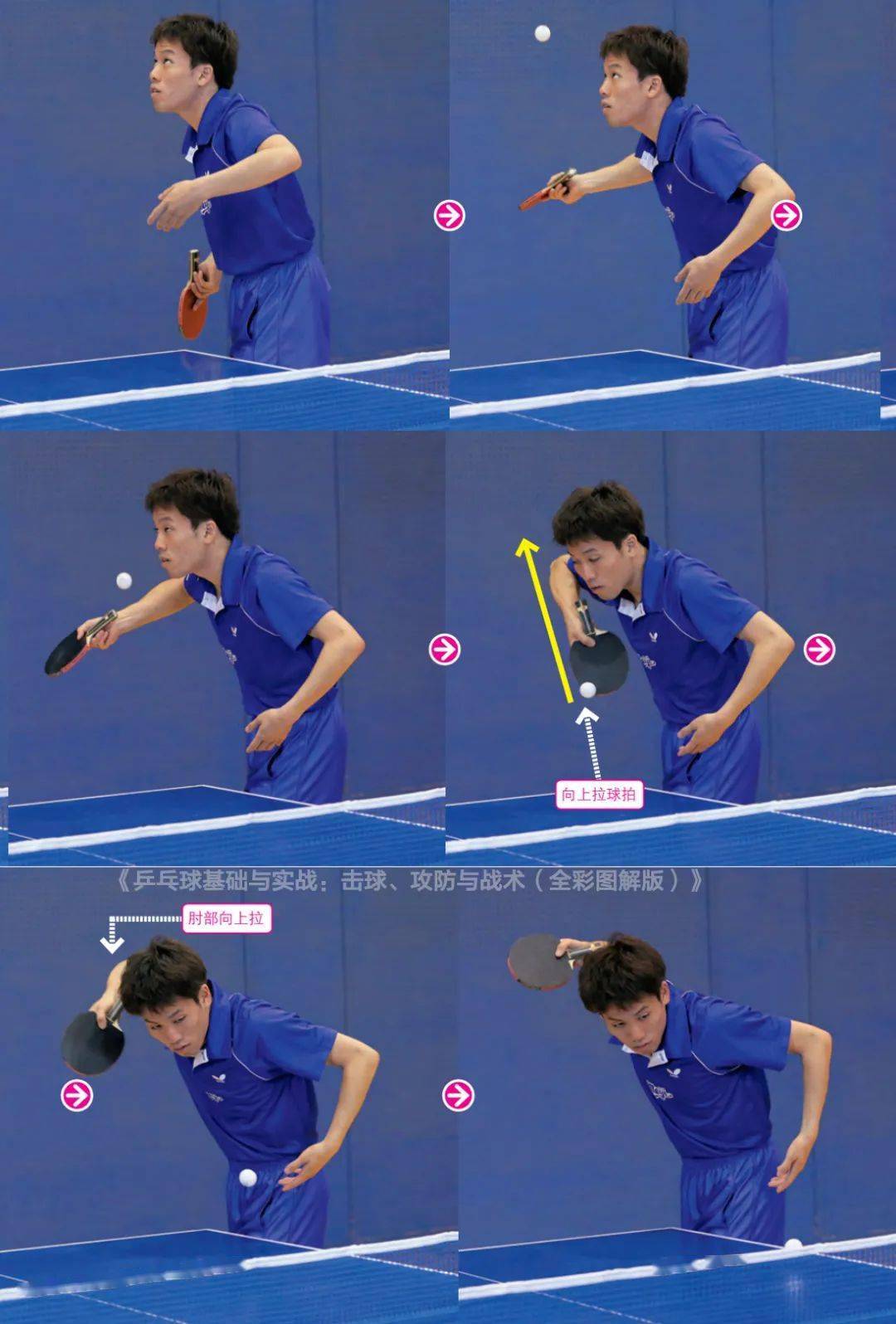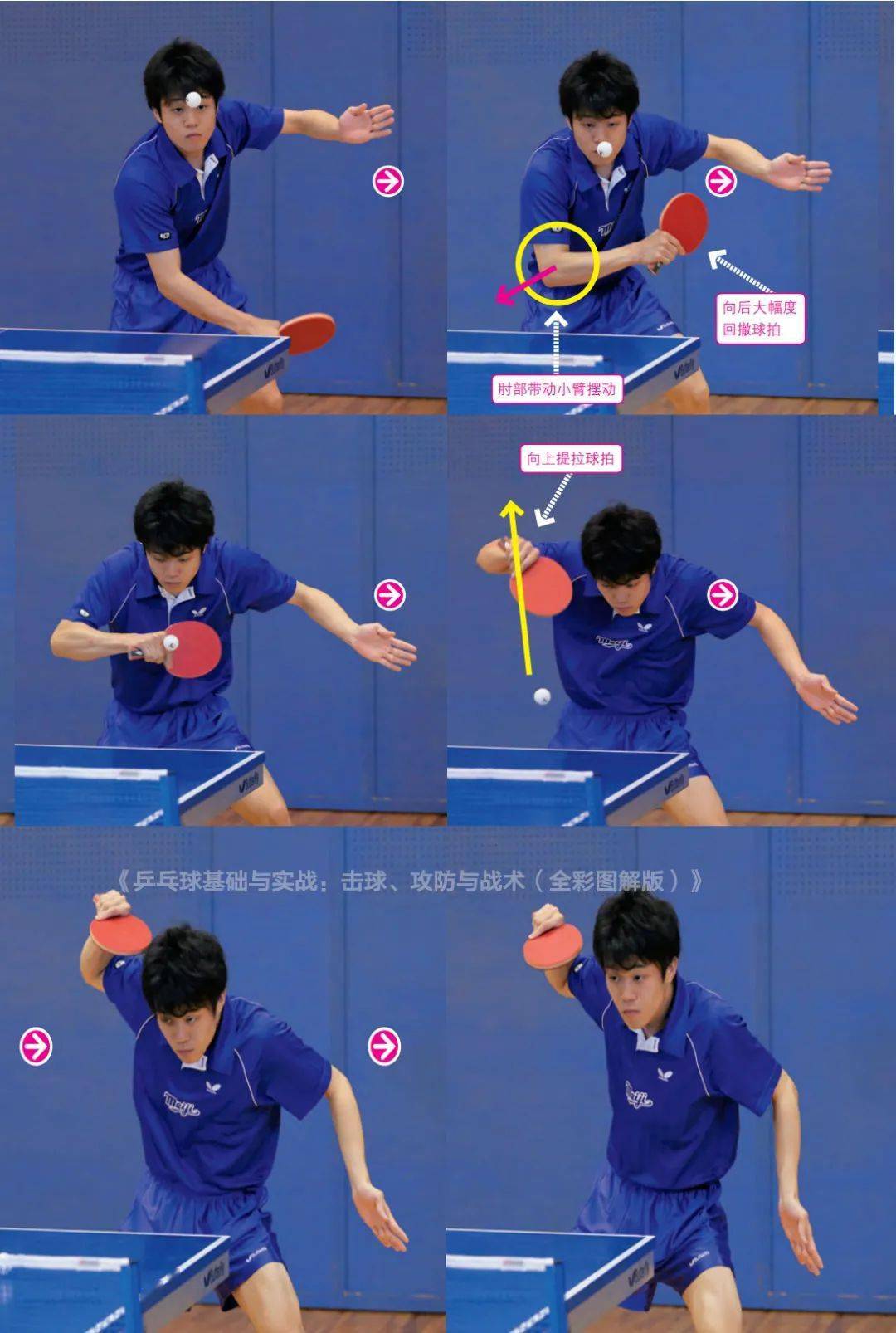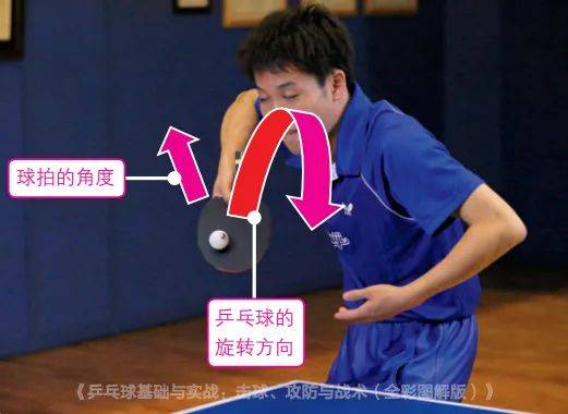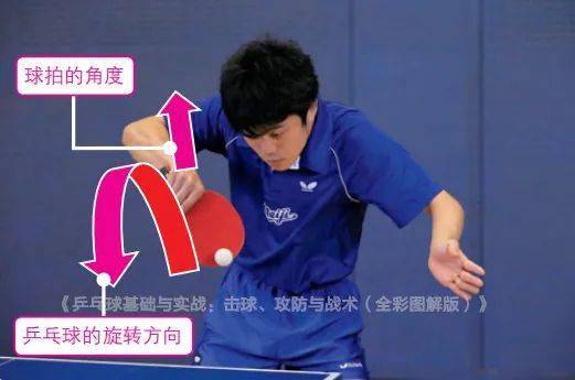 球拍的正面朝著對(duì)方,通過提起球拍的動(dòng)作摩擦乒乓球的后側(cè),從而得到向前旋轉(zhuǎn)的效果。