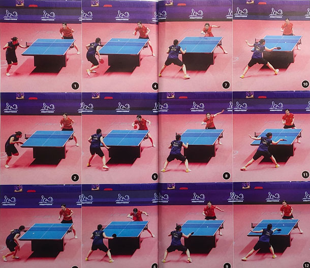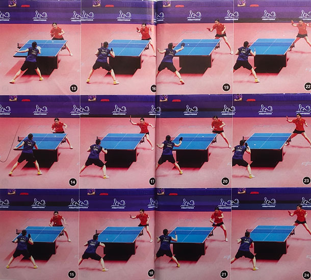圖21-22中,陳夢(mèng)壓低球板,從后下方向前迎球摩擦球的中后偏上部。為了化解長(zhǎng)膠來(lái)球軟、下沉和不易借力的特點(diǎn),她在觸球瞬間使用手腕適當(dāng)?shù)赝夥{(diào)整板形,增加對(duì)球的接觸面,通過(guò)撞擊釋放出更多力量,給球前進(jìn)的動(dòng)力。這些細(xì)微的技巧,充分展現(xiàn)了她在處理長(zhǎng)膠來(lái)球時(shí)的應(yīng)對(duì)能力和對(duì)球性的深刻理解。總體來(lái)看,陳夢(mèng)的這兩板進(jìn)攻雖然都不暴力,但質(zhì)量很高。特別是在與顆粒膠對(duì)峙的過(guò)程中,她沒(méi)有絲毫心虛、手虛,每一板吃球都非常扎實(shí)。打長(zhǎng)膠不能不發(fā)力,更不能亂發(fā)力,陳夢(mèng)很好地把握佳了擊球規(guī)律,繼而沒(méi)有讓何卓佳的戰(zhàn)術(shù)變化起到任何作用。