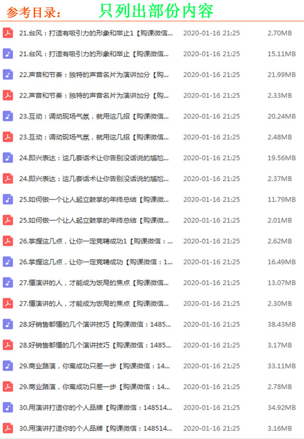 30節(jié)精選表達(dá)干貨課,分為基礎(chǔ)表達(dá)、技巧表達(dá)、高級表達(dá)、魅力表達(dá)、場景表達(dá)5大板塊。從0開始,全面系統(tǒng)的培養(yǎng)表達(dá)技巧需要該資源請加下圖微信!該資源工本費(fèi):12元