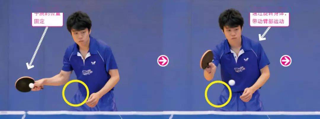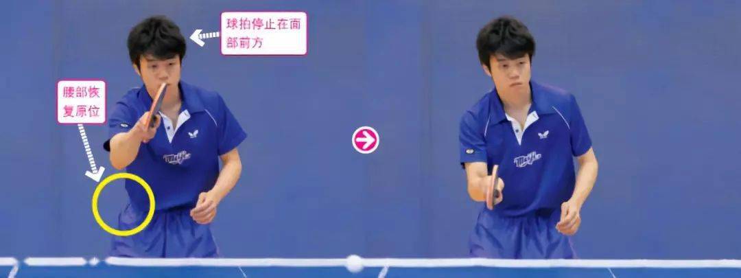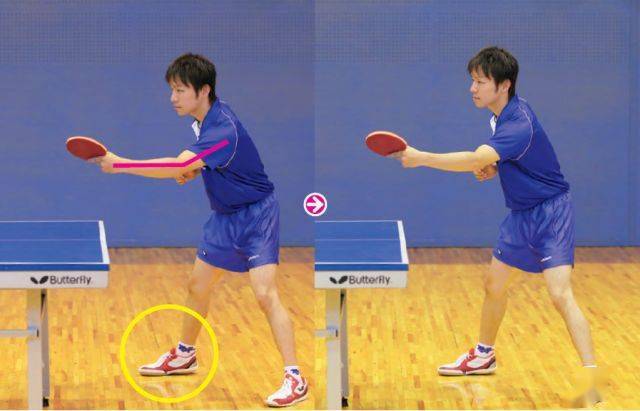 從側(cè)面的照片可以看到,擊球時幾乎不使用手腕的動作,而是揮動小臂。球拍正直向前揮動,擊打乒乓球的正后方。
