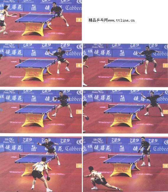 這組圖體現(xiàn)了孔令輝靈活的戰(zhàn)術運用——先壓馬林反手再變正手,然后再壓馬林反手,落點上的變化非常大。這種戰(zhàn)術套路的運用要有一定的技術水平作為依托。馬林要接發(fā)球上無法奪得主動,于是他作好了下一板反拉的準備。在這樣的前提下,孔令輝利用假動作,通過反手側(cè)拉的技術打落點,壓制住馬林,這種出其不意的進攻和落點變化意識很有威脅。隨后孔令輝反手一“抹”,用旋轉(zhuǎn)和落點優(yōu)勢,迫使馬林大范圍跑動擊球,這樣就為下一板進攻創(chuàng)造了絕佳的機會。孔令輝的這套戰(zhàn)術運用是橫板的經(jīng)典體現(xiàn)。
