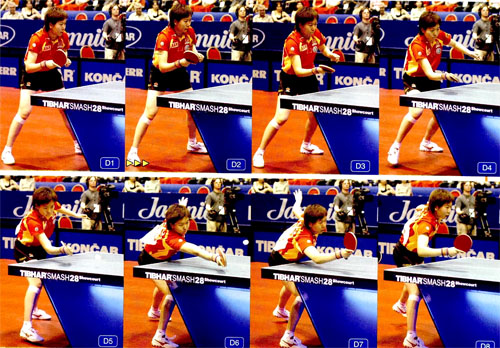 雙打比賽當中,發(fā)球一方為了擾亂接發(fā)球方,可能會發(fā)不轉或者側旋球,給接發(fā)球方的擺短造成困難。如果接發(fā)球方因為難以控制回球落點和高度而盲目挑打的話,則很有可能陷入對方提前設計好的圈套。我們通過李曉霞的一組接發(fā)球,來體會面對此類發(fā)球行之有效的搓球方法。李曉霞在向前迎球時,拍面稍稍向上,接觸球時肘部前伸動作較小、較快(D5-6)。由于她在搓球時,是觸球的正面部位,因此可以有效地控制好回球的高度。搓接不轉來球或側旋球時,如果接觸球的底部,回球非常容易冒高。像李曉霞這樣瞄準來球的正面部分,用一種“推球”的感覺來回球,這是搓接不轉來球或側旋球的技巧。