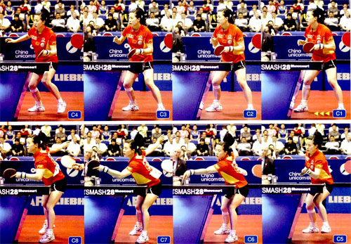 在雙打的接發(fā)球輪,搓球的穩(wěn)定性較高。我們來看看王楠是如何提高搓球威力的。第一個要點:觸球前的準備姿勢。將拍面朝上、不向后拉手,與接發(fā)球擺短姿勢相似(C5)。類似擺短的準備姿勢可以給對方造成判斷上的錯覺,王楠在觸球時手臂快速發(fā)力搓接,這是她的絕技(C6)。在這里特別強調(diào)的是王楠的左腳,她的左腳先抬起、在觸球的同時著地(C5-6)。王楠左腳的連貫動作可以調(diào)整擊球節(jié)奏,通過著地時重心的交換發(fā)力,手臂突然伸出可以起到出其不意的作用。在進攻性搓球時,可以有意識地注意左腳的動作。www.qikan.com.cnVxkMI6yxuFsUpD22