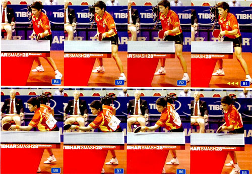 在雙打中,左手握拍選手比較有利。這是因為一左一右的配合,雙方的跑位不容易重疊,在來回當中更容易展開進攻。左手握拍選手的優(yōu)越性也體現(xiàn)在接發(fā)球輪上,請注意觀察陳玘接發(fā)球時的左腳——接發(fā)球前,陳玘右腳在前(B1),接發(fā)球時,陳玘左腳向前大步跨入臺內(nèi)(B6)。在擺短時,離球越近就越容易控制球,左手選手的左腳能夠深入球臺,也就是說能夠比右手選手離來球更近,更容易在擺短時控制球的長短高低,這是左手握拍選手的天然優(yōu)勢。www.qikan.com.cnVxkMI6yxuFsUpD22