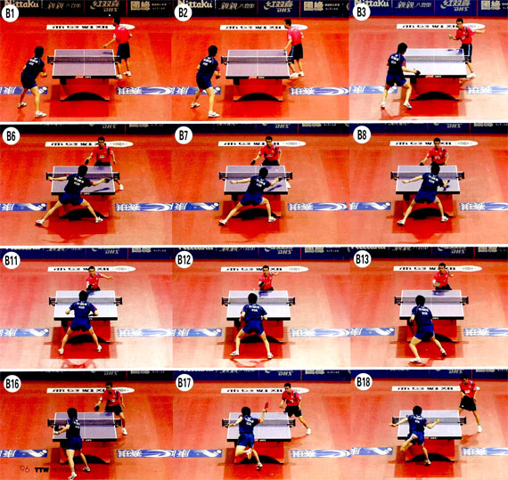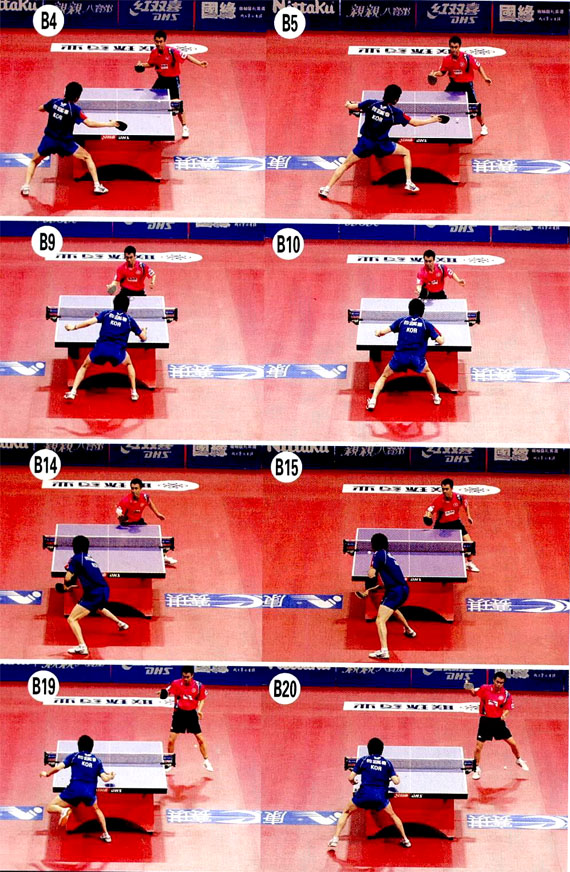 組圖B中,李靜發(fā)柳承敏正手位下旋短球(圖1-4),柳承敏上步擺短李靜的中路(圖5-9)。柳承敏的擺短速度很快,雖然旋轉(zhuǎn)不強(qiáng),而且弧線有些偏高,但是他回球比較突然。李靜沒(méi)有好的進(jìn)攻機(jī)會(huì),繼續(xù)回?cái)[柳承敏的反手位。李靜的回?cái)[缺乏摩擦,只是借力輕輕碰,因此回球過(guò)高(圖10-12)。柳承敏的還原速度很快,他右腳向后蹬地,左腳向后撤,讓開(kāi)擊球空間,同時(shí)開(kāi)始轉(zhuǎn)腰引拍(圖12-13)。擊球時(shí),他先將右腿向臺(tái)內(nèi)跨人,調(diào)整擊球位置,然后他左腿蹬地,抬高身體重心。用球拍正面迎球(圖14-15)。觸球瞬間,柳承敏發(fā)力向上蹬地,使身體騰空,充分利用了身體自下向上的力量,同時(shí)他向右前上方收縮前臂,手腕向上轉(zhuǎn)動(dòng)(圖16-17)。擊球后,柳承敏的上半身趴向球臺(tái),可見(jiàn)他還借助了身體向前的力量(圖18)。李靜面對(duì)兇狠的來(lái)球,防守不及,失分。www.qikan.com.cn07NFKvsHuO1KYRD1