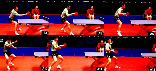 組圖A中,對方發(fā)王勵勤正手位短球,王勵勤先通過手臂尋找擊球點(圖2),當(dāng)來球位于上升后期時,王勵勤的手臂迎前,將球拍置于球臺上方(圖3),靠前臂的收縮,以中等力量挑打(圖4)。他挑打時的手腕動作并不明顯(圖3-4),因此回球的力量和速度都不突出,但他更注重落點,通過調(diào)動對方,遏制對方高質(zhì)量的進(jìn)攻。王勵勤擊球時,他的兩腳更加向前。身體的重心向后壓(圖4),這樣既保證了可以在身體完全到位的情況下?lián)羟颍€可以保證擊球后快速還原。王勵勤擊球后,右腳發(fā)力蹬地(圖5),左腳先向后墊一步,然后還原到相持的站位(圖6-7)。他還原后的右腳略微靠后,站位幾乎平行于球臺(圖8),這樣可以更好地照顧全臺的來球。對方回球到王勵勤正手位,王勵勤左腳蹬地,將重心壓向右腿(圖9),快速收縮前臂擊球(圖10)。王勵勤挑打后的站位雖然無法充分使用腰部力量,但是這樣的站位可以實現(xiàn)快速銜接,提高相持的速度。www.qikan.com.cn6eKi0i27UTMec3vF