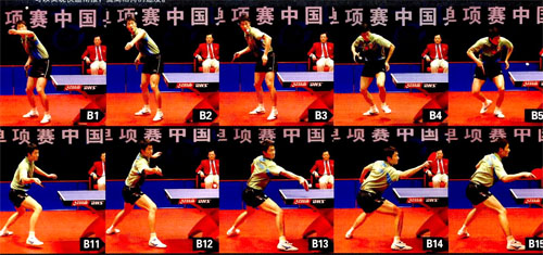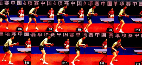 組圖B中,王勵勤發(fā)側(cè)下旋短球(圖1-8),他在觸球前將左腳抬起(圖4),然后在觸球瞬間使左腳同時落地(圖5),這樣有助于身體的發(fā)力;也更容易找到擊球點。王勵勤發(fā)球后迅速還原,在還原的過程中盯住對方回球的方式,預(yù)判回球的落點(圖7-8)。當(dāng)對方擺短王勵勤正手位時,王勵勤左腳蹬地,右腳向右前方跨出(圖9-11),同時他將手臂抬高,拍面略微上仰(圖12)。擊球時,他用球拍正面迎球,手腕下沉(圖13),然后快速收縮前臂,手腕向上轉(zhuǎn)動,以增強摩擦(圖14)。擊球后,王勵勤蹬右腳還原(圖15),在還原的過程中,他始終保持反手擊球的姿態(tài),以護(hù)住反手位空當(dāng)(圖16-18)。王勵勤還原到位之后,將重心壓向右腿,并降低重心高度,同時他小幅度轉(zhuǎn)腰引拍,準(zhǔn)備好正手連續(xù)進(jìn)攻(圖19)。