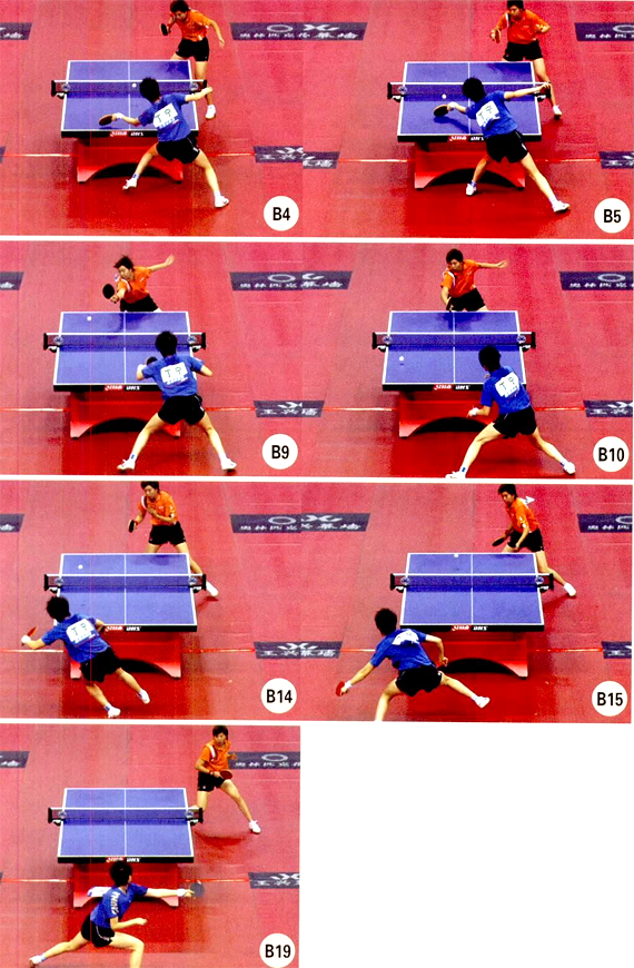 組圖B中,李曉霞發(fā)丁寧正手位短球(圖1-5),丁寧擺短時(shí)的摩擦不夠充分,只是輕輕“碰”了一板短球(圖6),因此出現(xiàn)了失誤。李曉霞挑打前,先將手臂拾起(圖7),這樣有助于發(fā)力。擊球時(shí),李曉霞突然晃挑直線(圖8-9),抓住了丁寧身體重心偏向其反手位的漏洞。丁寧起動(dòng)速度稍慢,只能勉強(qiáng)撲正手,用手臂將球勾起(圖10-13)。此時(shí)李曉霞盯住來(lái)球,迅速側(cè)身,在來(lái)球的上升期快速反拉直線,壓住了丁寧的反手空當(dāng)(圖14-18),丁寧回防不及,失分(圖19)。www.qikan.com.cnQXymla0SgIgAYuSN
