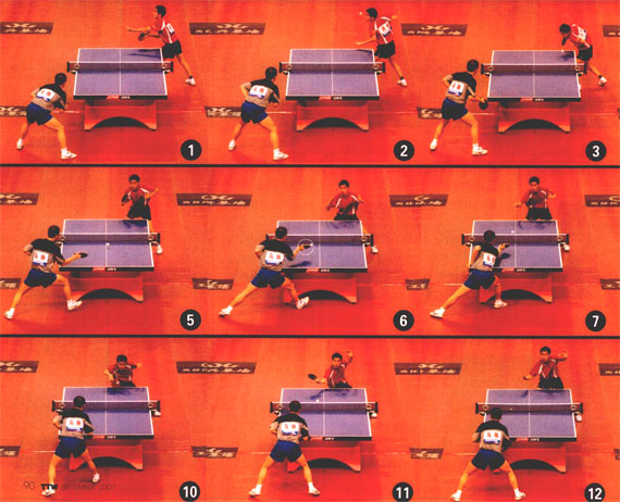 馬琳在上升擺短,加入手腕的寸勁兒,(如圖6),球擺到閆安的中路偏反手位。從圖8中我們看到這個球擺得似乎稍稍有些高,這是山于馬琳摩擦球的底部更多些。球雖稍高,但旋轉強烈。閆安采取臺內(nèi)側拉顯得摩擦不足,吃轉下網(wǎng)(圖9-12)。馬琳實現(xiàn)了接發(fā)球的第三級目標。www.qikan.com.cn6C2UvFYF4nER0gg8