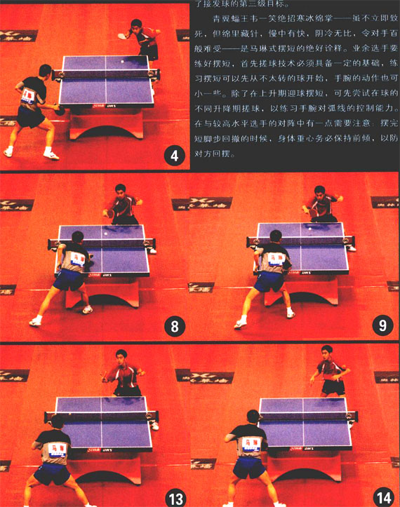 青翼蝠王韋一笑絕招寒冰綿掌——雖不立即致死,但綿里藏針,慢中有快,陰冷無比,令對手百般難受——是馬琳式擺短的絕好詮釋。業(yè)余選手要練好擺短,首先搓球技術必須具備一定的基礎,練習擺短可以先從不太轉的球開始,手腕的動作也可小一些。除了在上升期迎球擺短,可先嘗試在球的不同升降期接球,以練習手腕對弧線的控制能力。存與較高水平選手的對陣中有一點需要注意:擺完短腳步回撤的時候,身體重心務必保持前傾,以防對方回擺。www.qikan.com.cn6C2UvFYF4nER0gg8