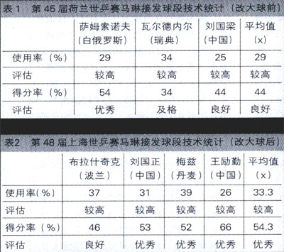 但是在改大球前后通過對馬琳接發(fā)球攻投的統(tǒng)計表明:馬琳的接發(fā)球十分優(yōu)秀,甚至是他主要得分手段之一。(見表1,2)