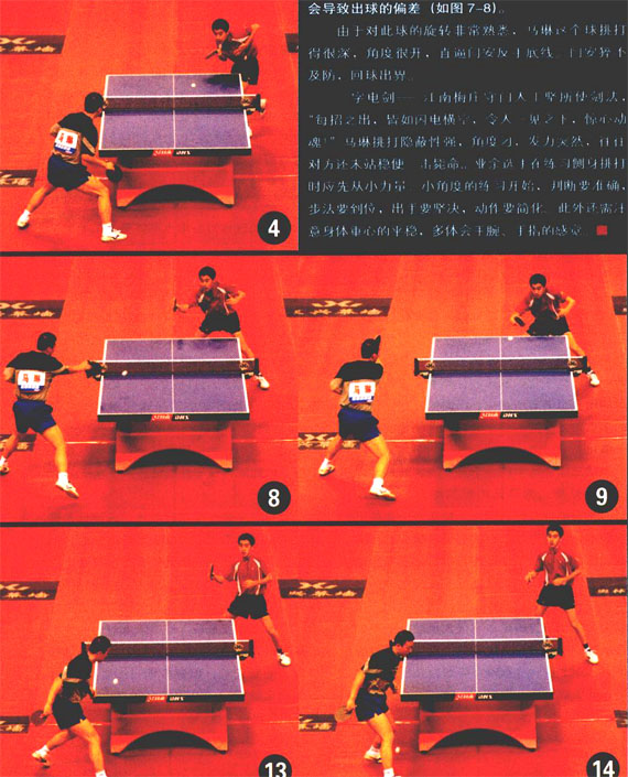 馬琳選擇了側身挑打,如不直接得分,也便于下一板正手連續(xù)攻馬琳在挑打的時候重心稍稍抬高,右肩和右腳提起,但左腳始終貼地,這樣較好保持了身體的穩(wěn)定(如圖6-9)。在觸球的剎那,馬琳持拍手手腕兒是相對扣緊的,但手腕打開的角度很大,與身體向左的晃動造成了強烈反差,給對手以迷惑挑打需要球拍中心遠端的拍頭擊球,細微的變動便會導致出球的偏差(如圖7-8)。www.qikan.com.cn6C2UvFYF4nER0gg8