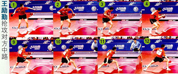 而當(dāng)對(duì)手是橫拍兩面攻時(shí),如上圖的王勵(lì)勤,進(jìn)攻對(duì)萬中路也十分有效。(如圖)