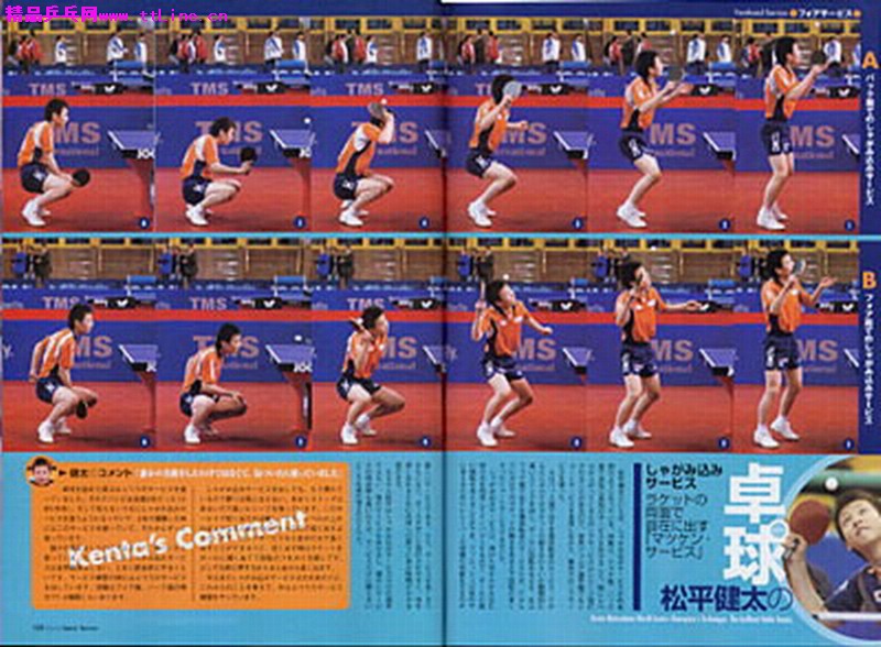 這種發(fā)球融會貫通了網(wǎng)球和棒球之長,將球高高拋起到3米左右,選手下蹲的同時豎著用拍切球,使球又快又轉(zhuǎn),讓對手在準(zhǔn)備時間和方向判斷上產(chǎn)生困難。用日本教練的話說“發(fā)球可謂是一擊扣殺。”