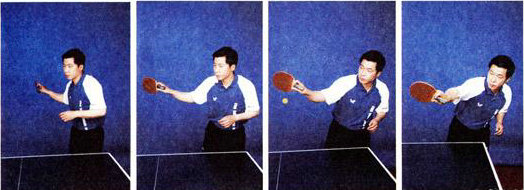 重心放在右腳。擊球時,上臂從下向上做環(huán)形揮動,拍面前傾,前臂和手腕同時下壓,