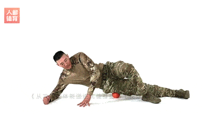 俯臥姿,雙肘與雙腳腳尖撐地,將筋膜球置于大腿左腿前側。雙臂推地,帶動身體移動,使筋膜球在膝關節(jié)至髖關節(jié)的范圍內來回滾動,尋找明顯酸痛點,并在酸痛點著力滾動。兩側交替進行。