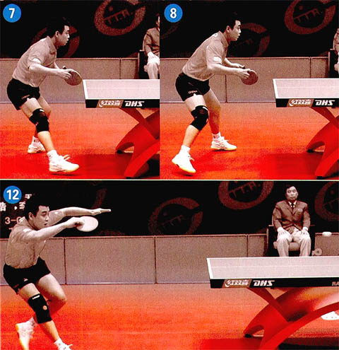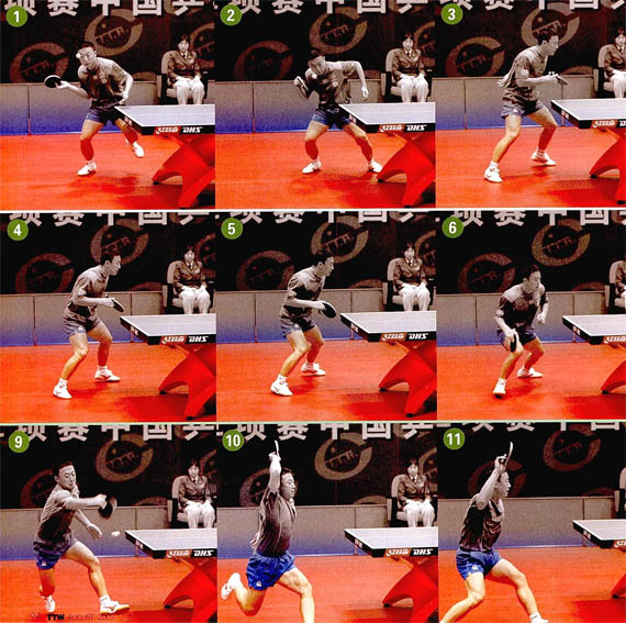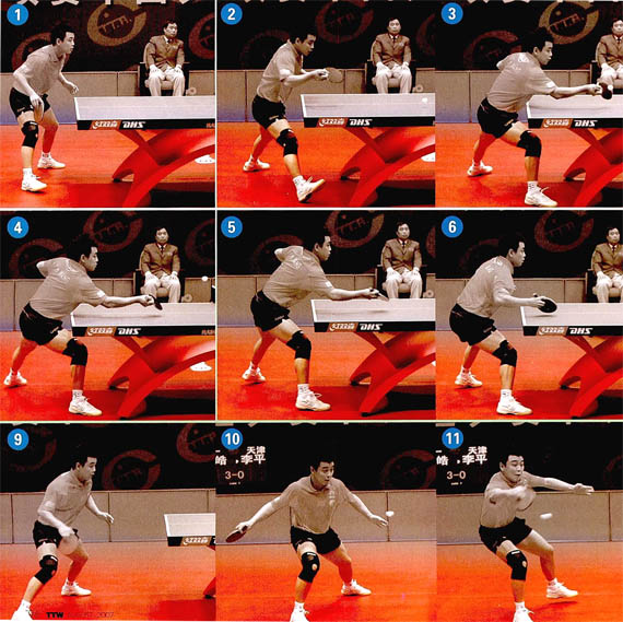 組圖選自第一次直通薩格勒布大循環(huán)馬琳對(duì)張超比賽的場(chǎng)景。圖1-5馬琳發(fā)下旋球到張超中路偏反手位,從圖5中馬琳右腿張緊的肌肉來看,他還原后準(zhǔn)備側(cè)身。但對(duì)方出其不意地把球劈到了馬琳的正手位大角度。圖6-10馬琳及時(shí)調(diào)整重心,交叉步上步拉球。(《乒乓世界》第7期封面亦為馬琳的交叉步拉球)