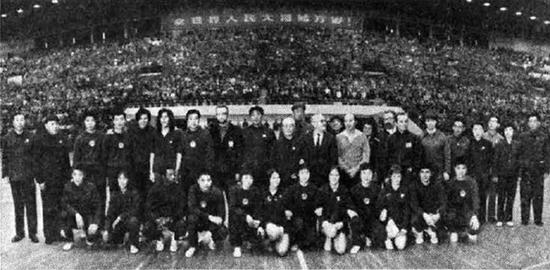 中、美乒乓球運(yùn)動員友誼比賽結(jié)束后,丁西林和有關(guān)方面負(fù)責(zé)人陪同斯廷霍文團(tuán)長走下主席臺,和兩國運(yùn)動員合影。新華社記者攝(刊發(fā)于《人民日報(bào)》1971年4月14日第6版)