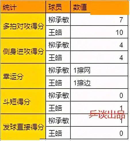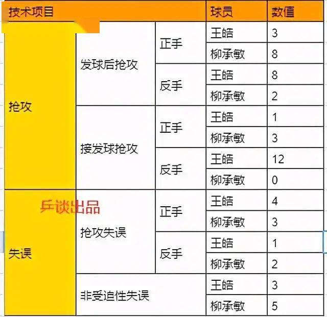 各項(xiàng)數(shù)據(jù)綜合下來,產(chǎn)生了比賽的最終結(jié)果,王皓輸了4局,除了第一局比分被拉開了,后面輸?shù)膸拙侄际?-11,每局只是2分啊,關(guān)鍵時(shí)刻少一個(gè)失誤就打平了。那么柳承敏贏在了哪里?