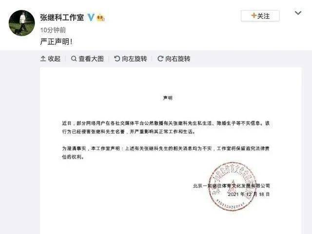 12月18日,據(jù)張繼科工作室微博發(fā)布聲明稱,表示私生活和隱婚生子等消息均為不實,已侵害張繼科先生名譽,將保留法律追責權(quán)利。