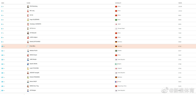 男單前五:樊振東、馬龍、許昕 、雨果·卡爾德拉諾 、張本智和。女單前五:陳夢(mèng)、孫穎莎、伊藤美誠(chéng)、王曼昱 、王藝迪。
