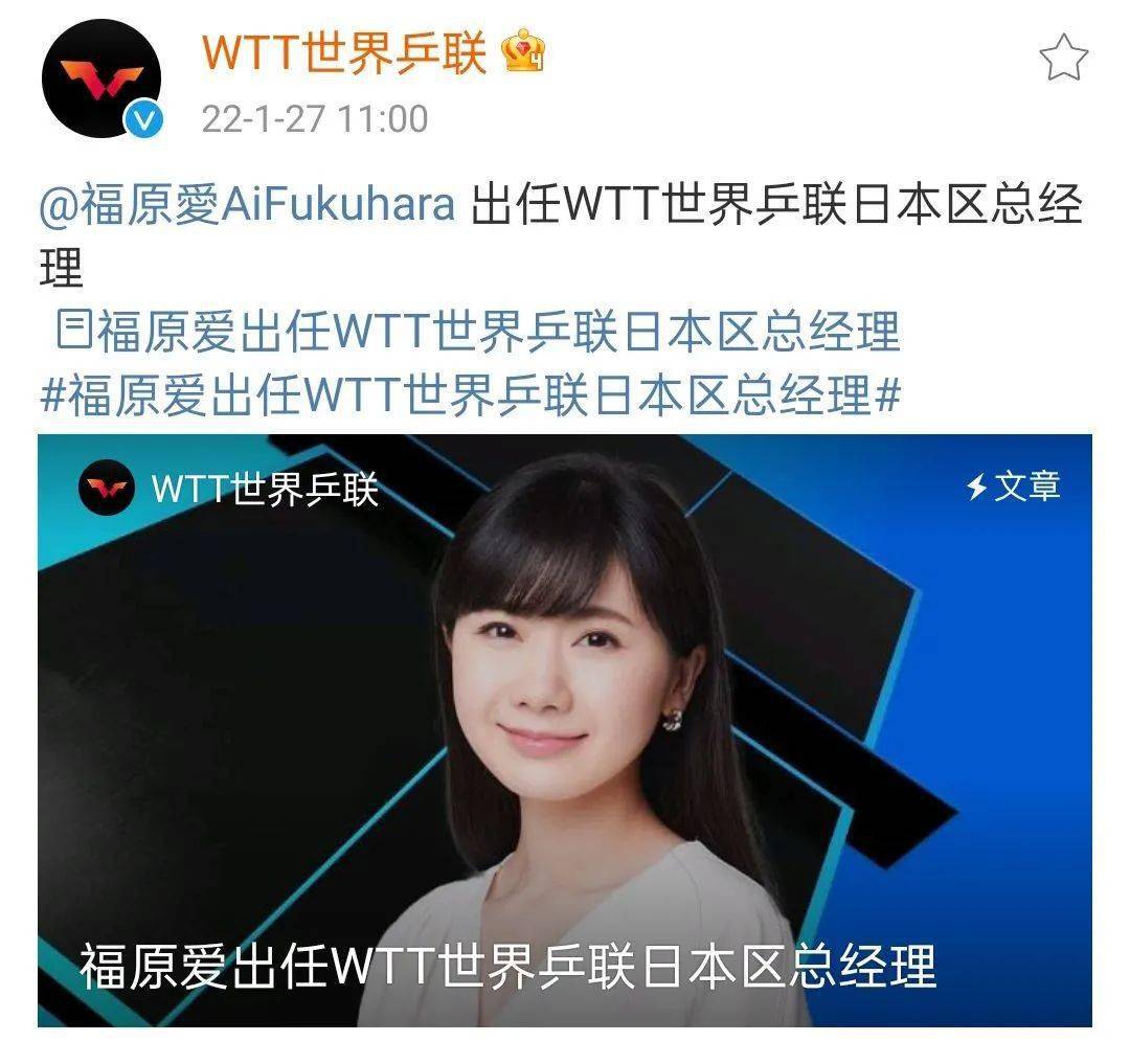 2022年1月27日消息,國(guó)際乒聯(lián)宣布,日本乒乓球名將福原愛(ài)將擔(dān)任WTT日本區(qū)總經(jīng)理,她也是日本區(qū)首位總經(jīng)理,日本是乒乓球運(yùn)動(dòng)在全球的重要市場(chǎng)之一,希望福原愛(ài)在新的崗位上做出成績(jī),為乒乓球運(yùn)動(dòng)在世界范圍內(nèi)的發(fā)展做出貢獻(xiàn),大家對(duì)她的個(gè)人能力很有信心。