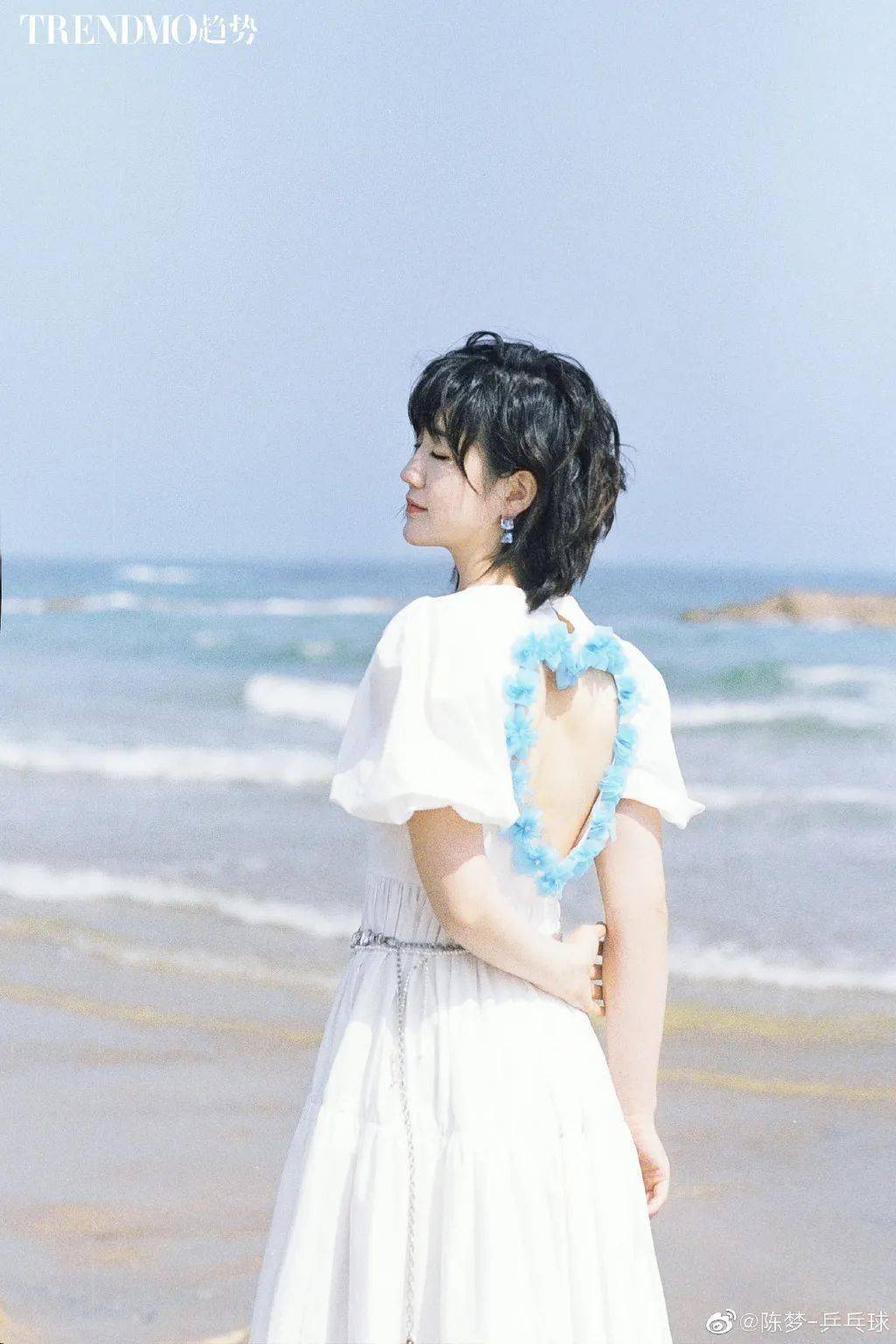 照片中,陳夢(mèng)身穿白色心形鏤空裙,置身浪漫海邊,賽場(chǎng)之下,演繹日常溫柔的一面。