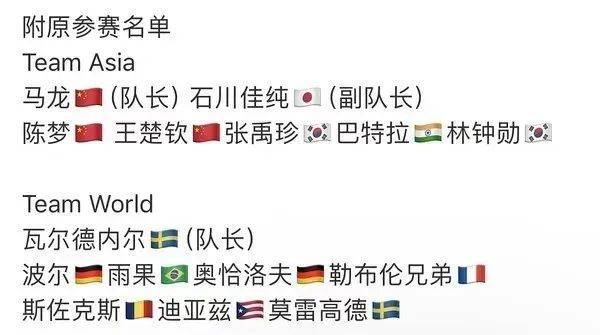 跳過了22年和23年,到了24年,老瓦還是世界隊的隊長,中國隊改成了亞洲隊,馬龍受邀任隊長。兩三年下來,世界隊實力增進(jìn)不少,全是歐美好手。
