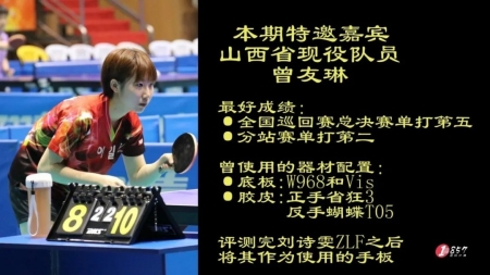 曾友琳--山西省現(xiàn)役隊(duì)員,最好成績是全國巡回賽總決賽第五名,分站賽單打第二名。器材配置為,底板:W968和Vis,膠皮:正手省狂3,反手蝴蝶T05。