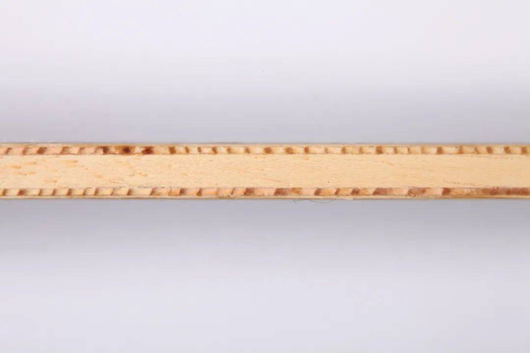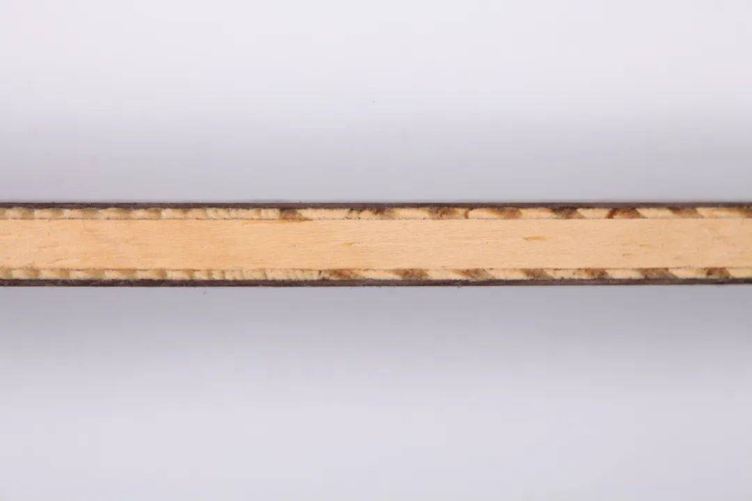 在傳統(tǒng)五夾板中,作為表層與里層的夾層,被統(tǒng)稱為球板的“力材”,由于表層和里層大多是以木質(zhì)纖維縱向安置,而夾層則多為木質(zhì)纖維橫向安置,由于橫置的木材纖維較短(最寬部位即為球板的最高寬度值),短纖維的振動幅度不大,且反饋更為密集,因此力材在球板的剛性方面起到著至關(guān)重要的作用。通常,力材較厚的球板會擁有十分強大的剛性,這也是許多早期硬五夾的風(fēng)格,例如蝴蝶馬祖諾夫、斯帝卡Tube系列,紅雙喜狂飚H-WL,都是加厚力材的代表作,同樣,也都是硬五夾的代表作。