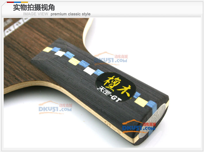 2)拍柄尾部的左側打上了GT-L資陽的火印,其中“GT”代表了天罡系列,“L”則表示這是一款橫板。拍柄上的標牌注明了底板名稱,“檀木”二字與紅雙喜近年來推出的天罡系列硬木底板采用了相同的毛筆字體,透露出一絲復古的氣息。