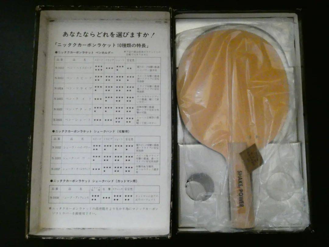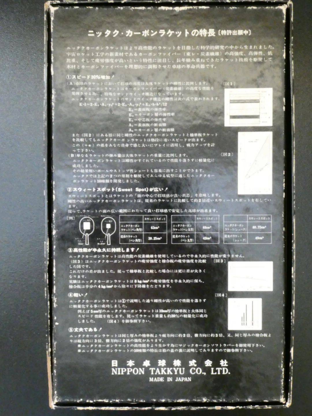 先為大家介紹的是N-1037 Shake Power,它是我第一支Nittaku Carbon Racket收藏。包裝是用超重量級的硬卡紙制造,而且是Nittaku很少用的天地盒設(shè)計。包裝上的信息非常之多,在盒底記載了Nittaku當(dāng)時對碳纖這種新材料的說明,當(dāng)年是把單檜球板的彈性和碳纖球板作了比較。↓↓↓