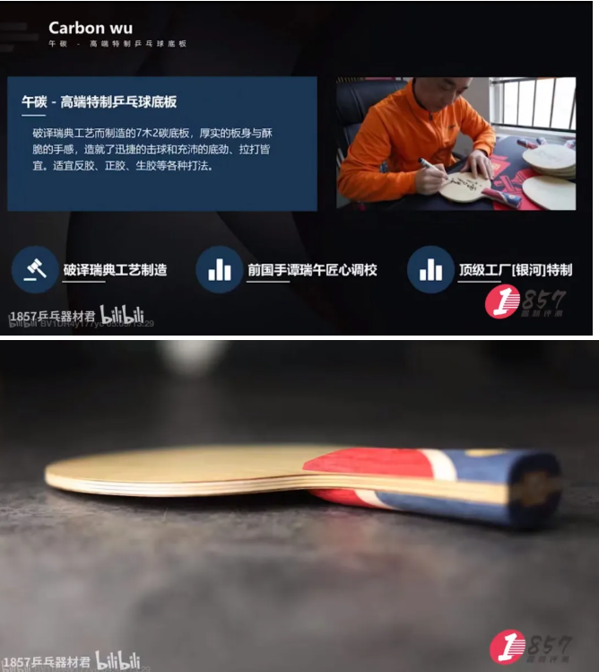 試打測(cè)評(píng)的乒乓球底板是銀河公司與譚瑞午先生合作出品的:銀河午碳-譚瑞午特制乒乓球底板。