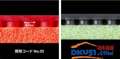 海綿構(gòu)造:通過(guò)和左邊的T05對(duì)比,可以看出蝴蝶艾比斯AIBISS套膠是一款高密度海綿。