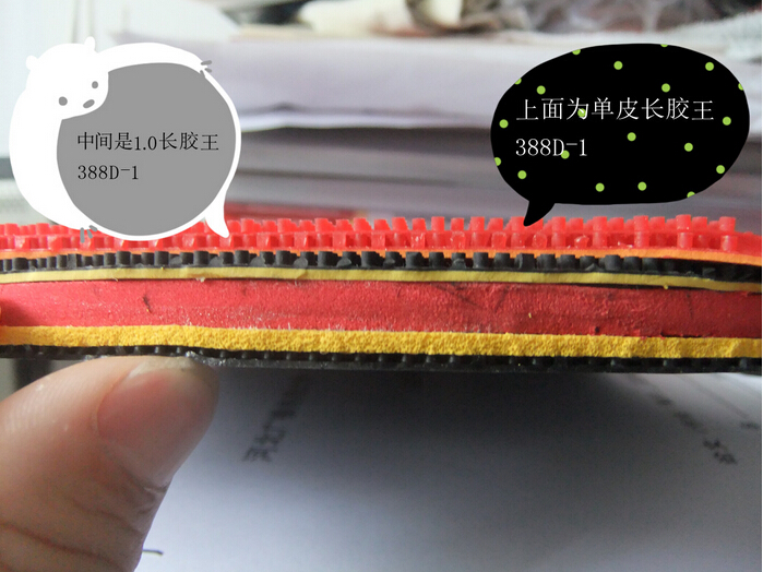 收到膠皮,用手摸了一下,感覺膠皮比388D-1要稍硬,用手拉了一下,感覺韌性十足。海綿因為是1.0-1.3的,明顯要比我原來用過的要厚,摸著比大維或友誼的海綿要稍硬,但是并不算太硬。不知道這個55度是怎么個算法。