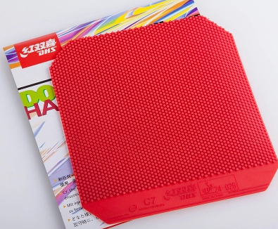 本人打法:橫板斯蒂卡to,正手狂3、40度。反手c7紅色海綿厚度1毫米(以前用755) 感官:膠皮為紅色,海綿為橙色!底皮不是傳說中那么厚,和我以前用過的755差不多!膠粒比起其它長(zhǎng)膠較粗較短!膠粒上有花紋! 使用感受: