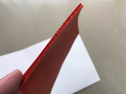 說說試打配置吧,用的是業(yè)余削球中很常見的“980”底板,采用削球來測試這款套膠是有原因的,“傳奇563”正膠和此前的729老款563正膠是有一些差別的,比如在膠粒的長度上,大家看圖,729傳奇563的膠粒相較于普通的生膠、正膠要微長一點,膠粒按撥起來也很用韌勁兒,整體的感覺很接近于半長膠的類型。