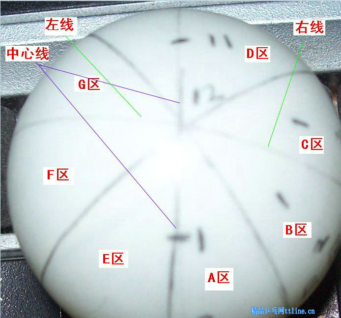 首先請大家認(rèn)真看本貼一樓的擊球點(diǎn)詳解乒乓球圖01到03,標(biāo)著1、2和11和12的那條線,是球的中心線,以那中心線為基礎(chǔ),我向右標(biāo)出了A,B,C,D,區(qū),我向左標(biāo)出了E,F(xiàn) ,G,區(qū),以球后部3點(diǎn)處,作一水平橫線分了A至G區(qū)的各上下半?yún)^(qū)。