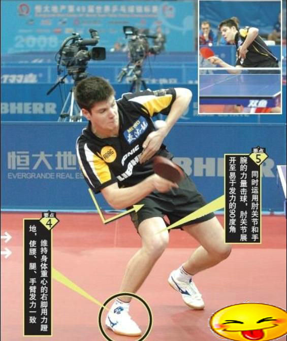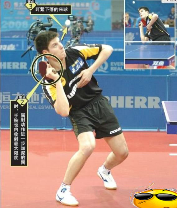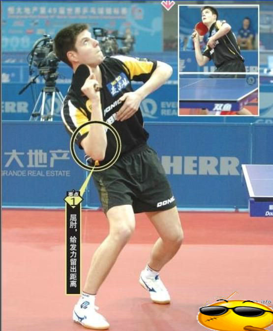 照片中是奧恰洛夫的側(cè)上(下)旋短球。他的正手發(fā)球以發(fā)中路偏正手的上(下)旋居多。變化莫測的發(fā)球使他本身就厚實的中遠臺實力更增威脅。