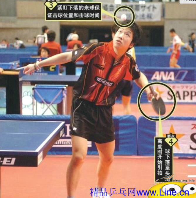 水谷隼發(fā)球動作的最大特點是“引拍很晚”。球拋起后持拍手較為放松,球到達最高點開始下落卻仍然不做任何動作,直到球落至頭頂高度時突然啟動,前臂手腕加速發(fā)力,一氣呵成。