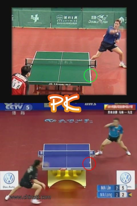 仔細看上下兩圖,是不是有種異曲同工的感覺,無論是結束時的位置、腳步動作、對手位置都很相像!再比較兩人的落點,幾乎是在同一個位置:壓在了球桌的白線部份,幾乎看不到球,這個位置離對手還有一兩個身位,無論如何都夠不到了.(國梁直接沒動,小馬試圖撲救已經(jīng)來不及了)